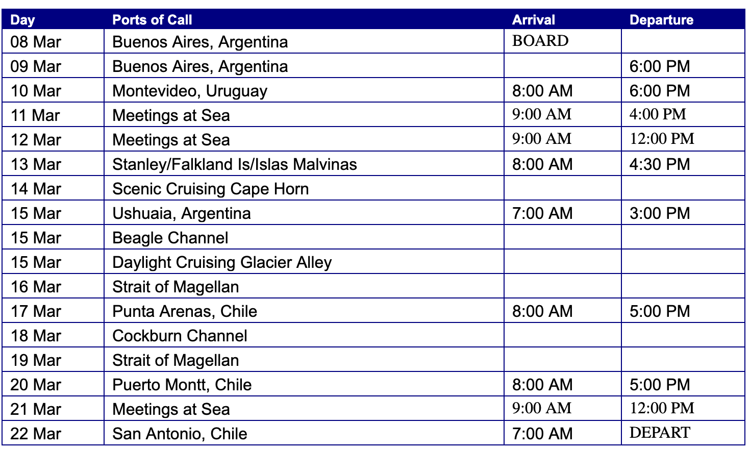 Join CU EduCruises for an amazing 14 Day cruise to the beautiful landscapes and rich history of South America! Unwind on a cruise to Argentina, Uruguay, and Chile, featuring an overnight in Buenos Aires and the spellbinding scenery of Glacier Alley and Cape Horn. Shore excursions are plentiful! See a tango show, stroll through Montevideo’s Old Town, wave at the penguins in Stanley, enjoy a scenic alpine drive! You’ll find your home onboard the Oosterdam with luxurious accommodations, diverse dining choices and endless entertainment.
